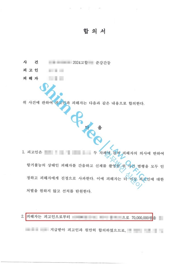 대표 변호사님은 단순한 금전적 보상을 넘어, 2차 피해 방지와 피해자의 심리적 안정을 위한 합의를 목표로 하였습니다. 따라서 촬영물 미소지, 비밀유지, 접근보〮복금지, 통신제한 등 피해자에게 유리한 조항을 추가하여 합의를 진행하였습니다.