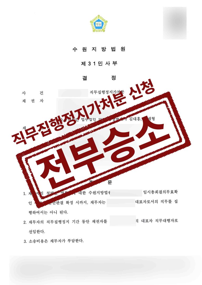 권한 없이 임시총회 소집 ,회의록 위조 등 적법한 결의가 아님을 주장하여 직무집행정지가처분 인용