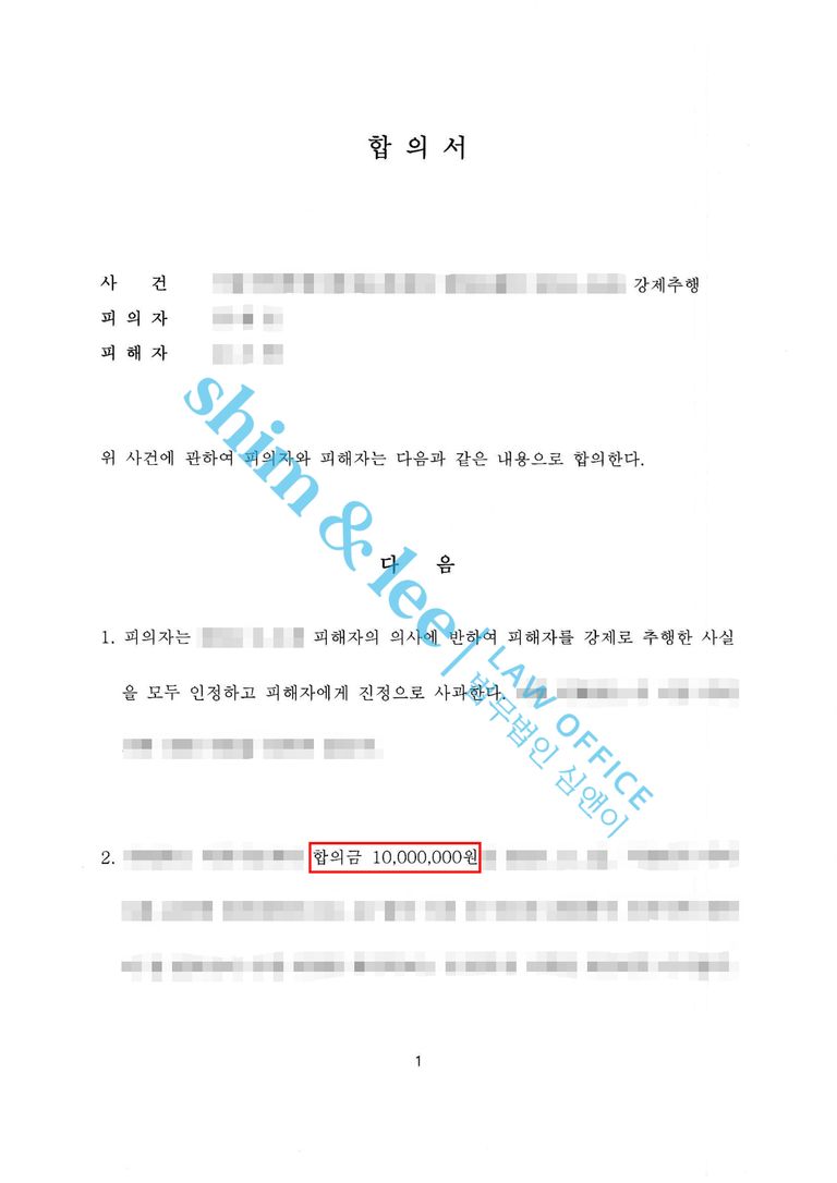 - 대표 변호사님의 단호한 태도에 가해자는 합의가 결렬되어 형사고소가 그대로 진행될 것을 우려하여, 단기간에 처음 제안한 금액의 3배가 넘는 합의금 1,000만 원을 마련하였습니다.