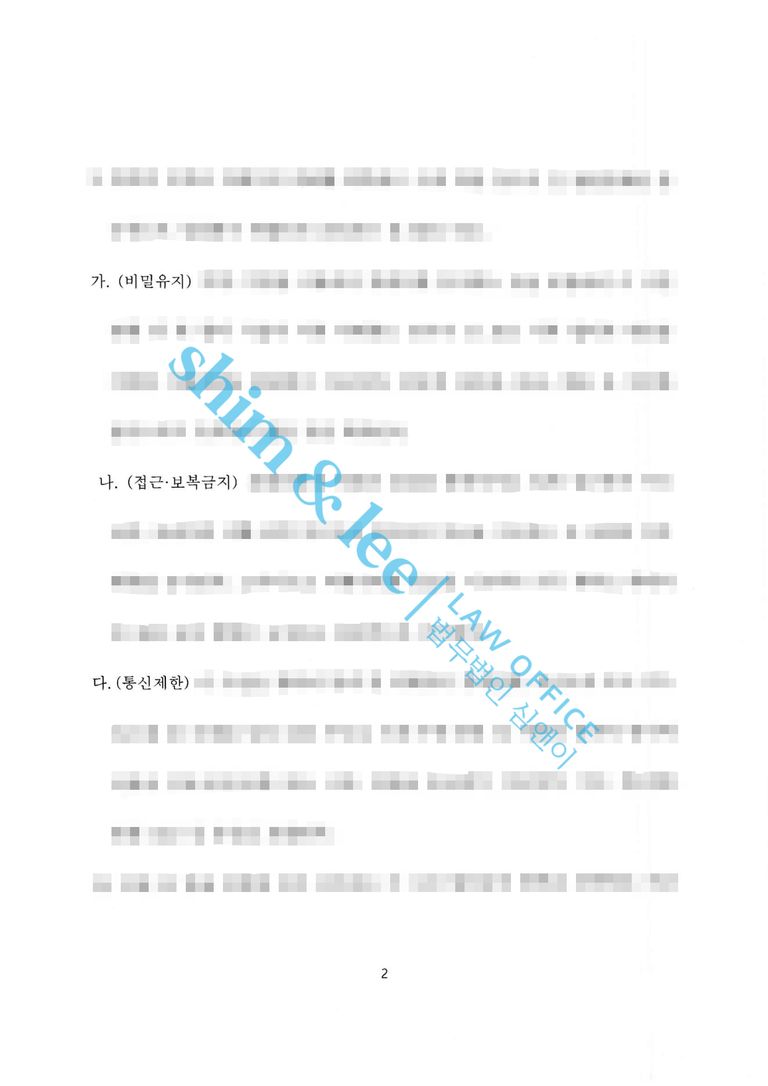 - 이밖에도 비밀유지, 접근 및 보복 금지, 통신 제한 등 2차 피해를 방지하기 위한 조항들을 포함하여, 의뢰인에게 유리한 조건으로 합의를 마무리하였습니다.