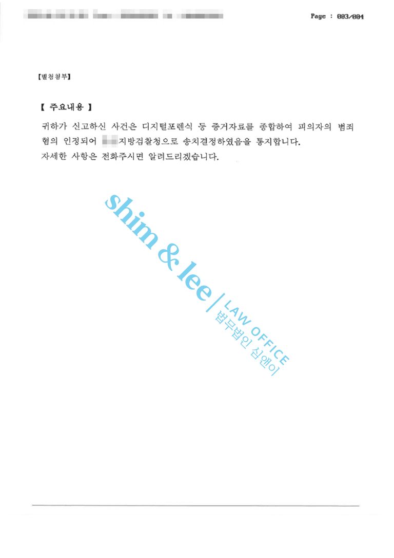 - 담당 수사관은 고소 보충서와 변호사 의견서에 담긴 가해자의 구체적인 범행 내용과 의뢰인의 일관된 진술을 종합해 피해자 진술의 신빙성이 높다고 판단하였고, 결국 사건은 검찰로 송치되었습니다.
