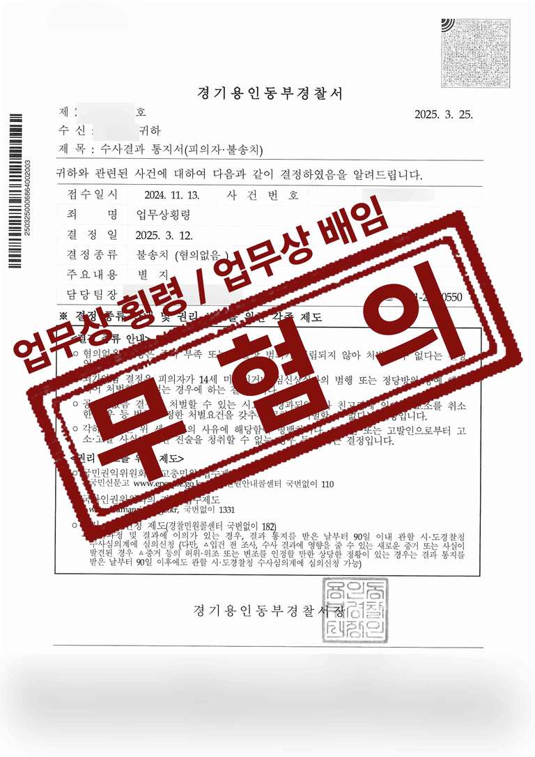 이에 업무상횡령 및 업무상배임에 대해 모두 무혐의를 받을 수 있었습니다.
