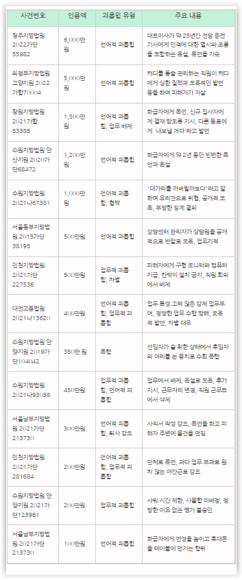직장 내 괴롭힘은 개인의 인격권을 침해하는 심각한 문제이나 법원에서 인정하는 위자료는 실제 피해를 배상하기에는 다소 적은 수준으로 보이고, 또한 승소하기 위해서는 괴롭힘 행위가 존재하였다는 점을 명확히 입증해야 한다는 점을 주의하시기 바랍니다.