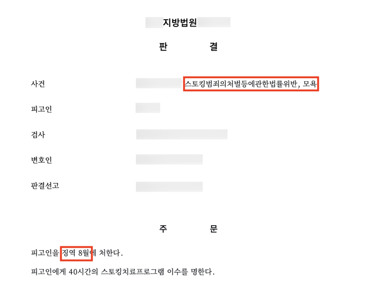 법원은 이러한 반복적이고 집요한 행위에 대해 스토킹처벌법과 형법상 모욕죄 모두를 유죄로 인정하고, 피고인에게 징역 8개월과 스토킹 치료프로그램 40시간 이수를 명했습니다. 반성 없는 태도와 피해자에 대한 지속적인 접근, 그리고 강한 모욕 표현이 양형에 불리하게 작용했습니다. 이번 사건에서도 저는 피해자의 진술이 법정에서 왜곡되지 않도록 증거와 정황을 정밀하게 구성했고, 피고인의 태도와 범행 경위가 판결에 온전히 반영될 수 있도록 집중했습니다. 스토킹 사건은 단순히 연락을 반복하는 문제가 아닙니다. 피해자의 일상과 안전, 존엄에 대한 침해입니다. 합의나 형사 절차에서는 반드시 변호사의 조력을 받으셔야 합니다. 독단적으로 진행할 경우 합의금이 터무니없이 낮거나, 가해자에게 유리하게만 끝나는 경우가 많습니다. 실제로 수천만 원의 차이가 발생하는 사례도 흔합니다. 저는 피해자의 권리를 지키고, 필요한 경우에는 강한 처벌까지 이끌어내는 데 자신 있습니다.
