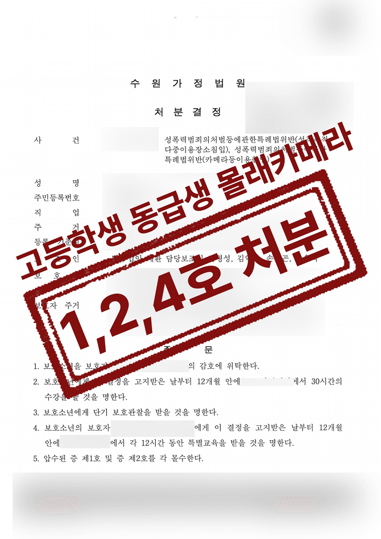 법무법인 대환 학교폭력변호사는 2가지 혐의를 받은 의뢰인의 상황에서 최선을 다하였고, 결과적으로 부모 및 본인교육(1,2호처분)과 4호 처분(단기보호관찰 1년)을 받았습니다. 2가지 혐의, 그리고 중범죄 사안이므로 소년원처분까지 나올 수 있는 상황이었지만, 의뢰인은 다시 학교로 돌아갈 수 있었습니다.