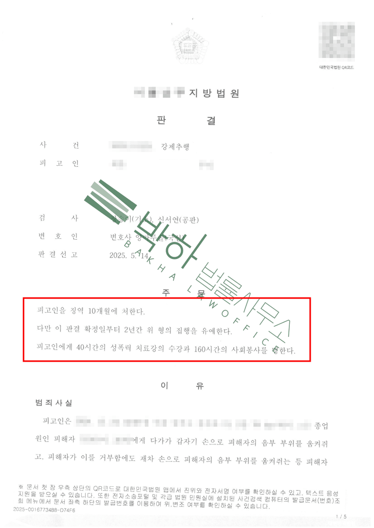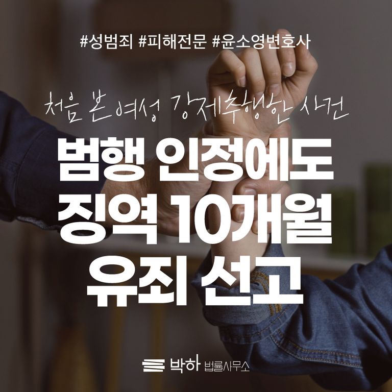 재판단계에 이르러 가해자가 모든 범행을 인정하였음에도 불구하고 가해자는 징역 10개월에 집행유예 2년, 40시간의 성폭력 치료강의 수강과 160시간의 사회봉사를 선고 받게 되었습니다.