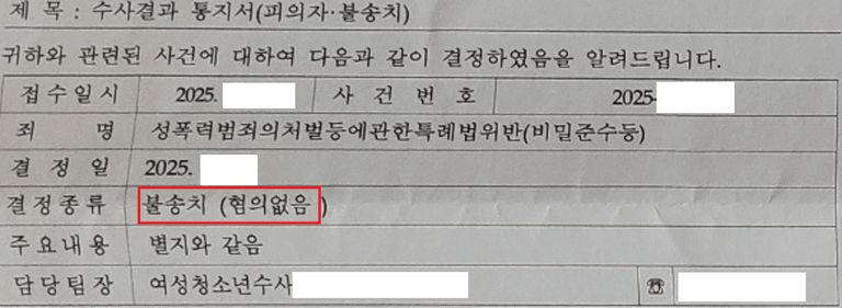 경찰은 저의 의견을 수용하여 불송치(혐의없음)로 결정했습니다.