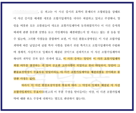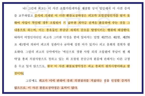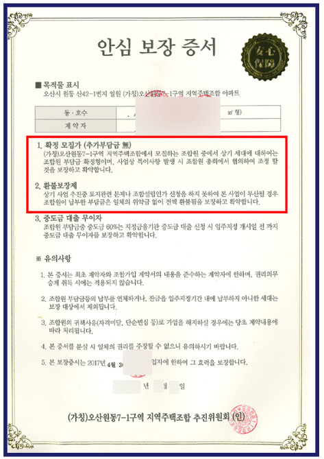 하지만 이 안심보장증서는 조합원 총회의결이라는 필수 절차를 거치지 않고 일방적으로 발급된 것으로, 법적으로는 무효에 해당한다는 판결이 수년간 다수 법원에서 일관되게 내려져 왔습니다.