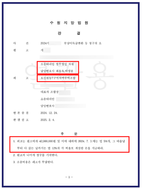 이에 최동욱 변호사는 해당 문서의 법적 하자를 지적하며 소송을 제기하였고, 그 결과 수원지방법원은 오산원동7구역 지역주택조합이 의뢰인에게 납입금 4,200만 원 전액과 이에 대한 지연이자를 지급하라고 판결하며 전액 승소를 선고하였습니다. 현재 최동욱 변호사는 오산원동7구역 지주택의 조합 재산에 대한 압류 절차를 진행하고 있으며, 의뢰인은 가까운 시일 내에 피해 금액을 회수하실 수 있을 것으로 보입니다.