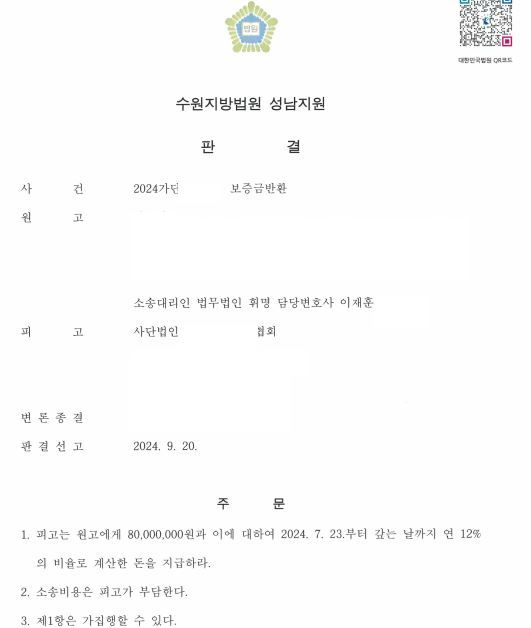 원고를 대리하여 사단법인 ㅇㅇㅇ협회에 대한 보증금반환 사건 승소 사례