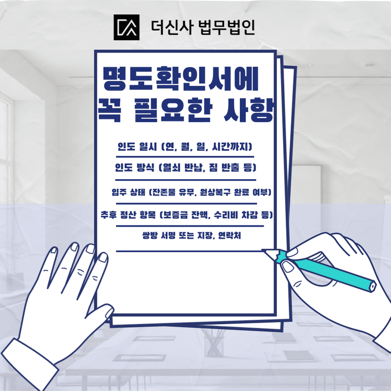 따라서 명도확인서는 단순한 서류가 아니라, 퇴거 이후 발생할 수 있는 법적 분쟁에 대비하기 위한 중요한 증거 문서입니다. 작성 단계부터 꼼꼼히 준비해두는 것이 안전한 마무리를 위한 첫걸음입니다.