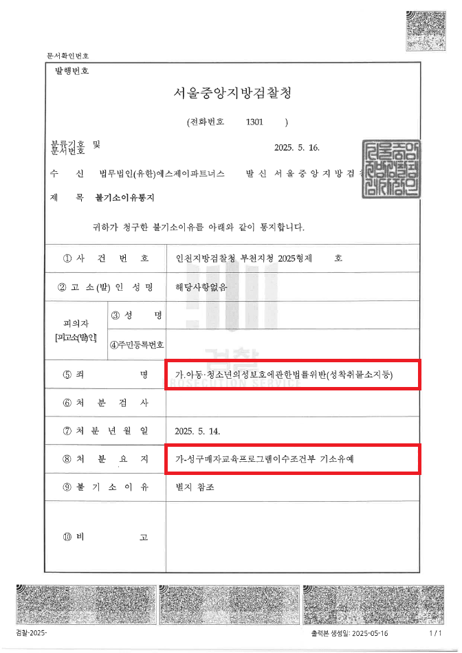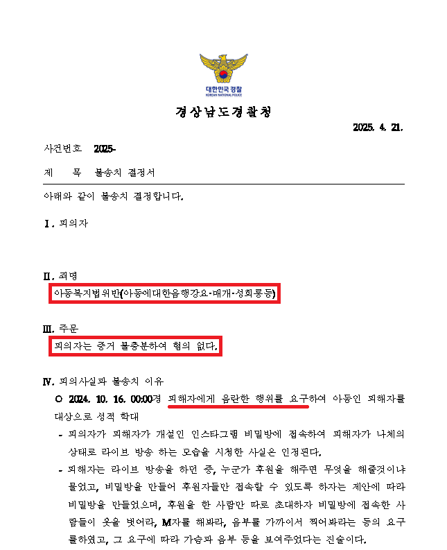 얼마 뒤, 사건은 아동복지법위반 혐의는 불송치되고 아청법위반(성착취물소지등) 혐의만 송치되었습니다.