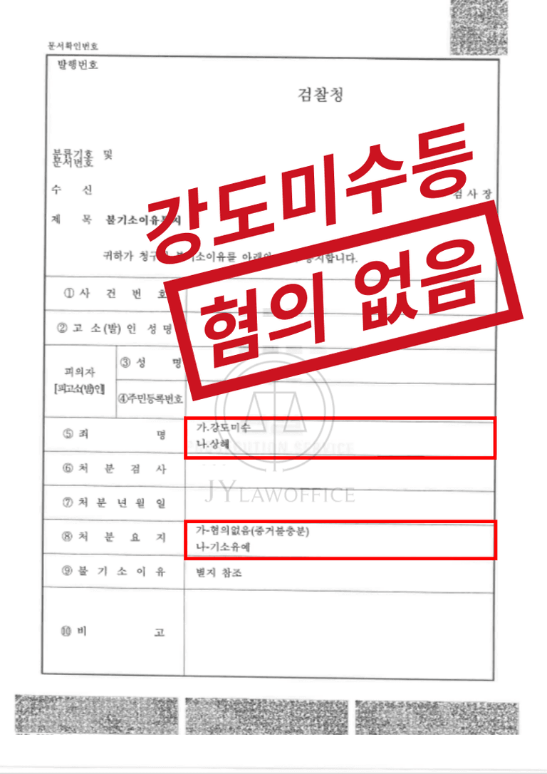 이와 같은 본 형사 전문 변호사의 조력에 따라, 의뢰인은 강도 미수 혐의에서는 혐의 없음의 처분을, 상해 혐의에서는 기소유예의 처분을 받고 형사 처벌 없이 무사히 사건을 종결할 수 있었습니다.