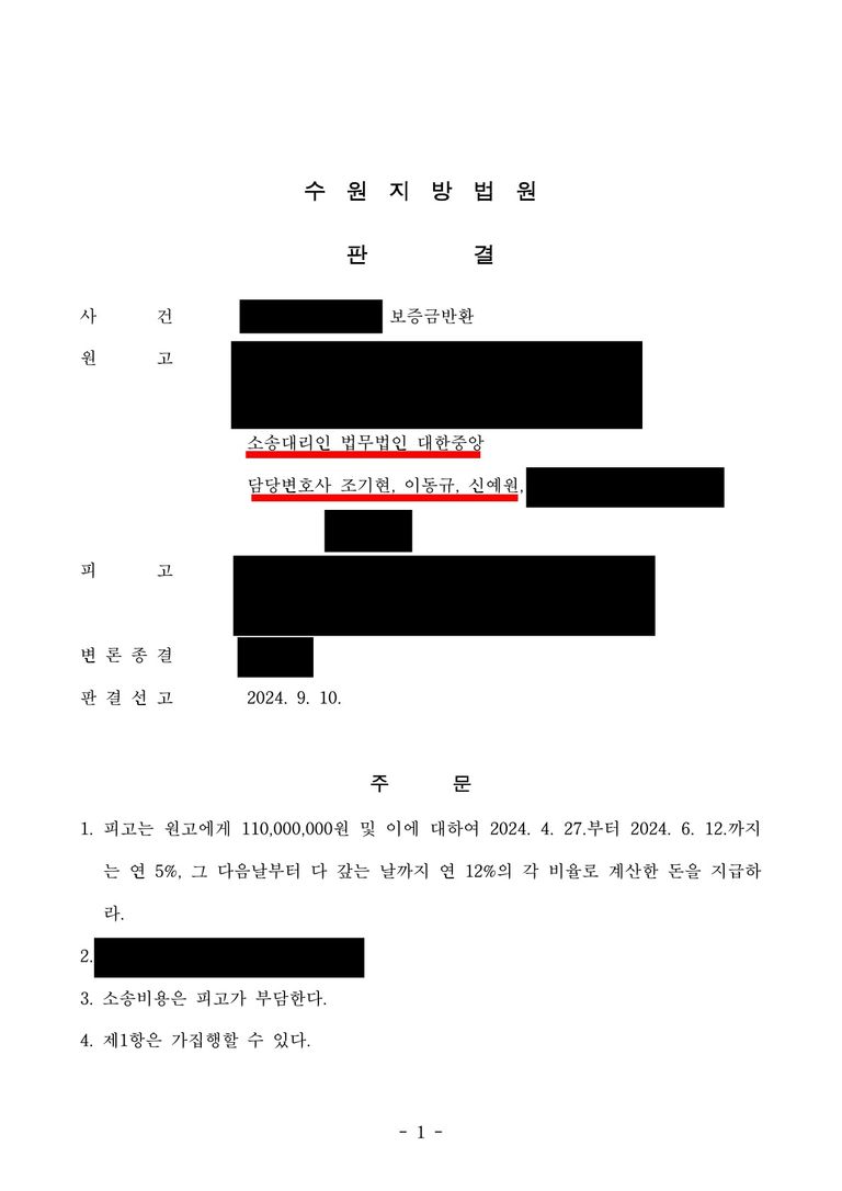법원은 이동규 변호사의 주장을 받아들여 전세보증금 1억 1천만원 전액을 반환하고, 소송비용까지 임대인이 부담하라는 판결을 내렸습니다.