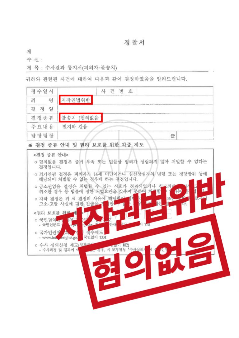 저작권법 위반으로 고소장을 받았다고 하더라도 항상 저작권 침해가 성립되어 처벌이 내려지는 것이 아닙니다. 각각 사안에 따라서 성립이 되지 않을 수 있어 과연 상대방이 주장하는 것이 타당한 것인지, 만일 타당할 경우 처벌 감경을 받을 만한 요소는 없는지 등을 체크해 보고 적절한 방어 전략을 세워나가야 합니다. 실제 침해를 했다고 해도 변호사의 조력에 따라 그 결과가 달라질 수 있을 것입니다.