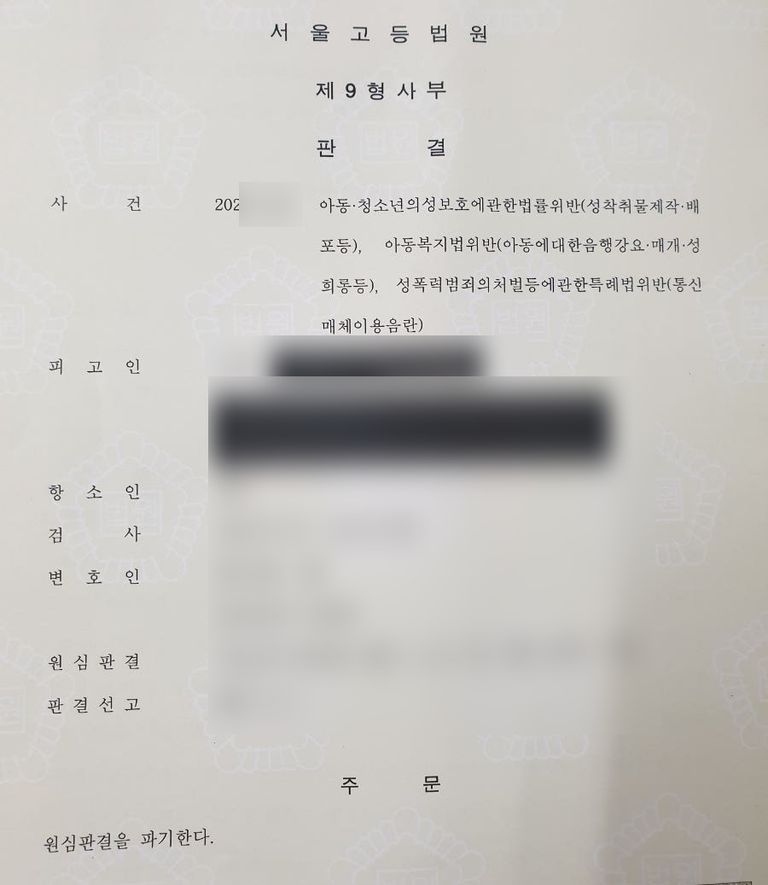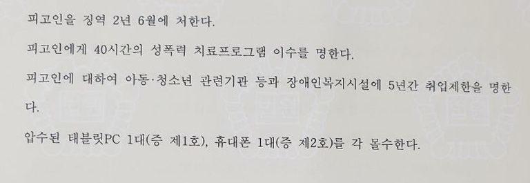 1심에서 징역3년이 선고되었으나, 피해자 2인 중 1인과 합의가 됨으로써 6개월이 감형되어 징역2년6월이 선고되었습니다. 그리고 취업제한명령 5년이 그대로 유지되었습니다.