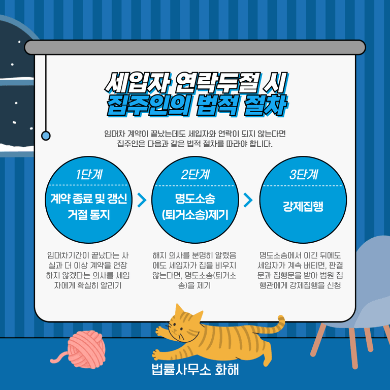 임대차 계약이 끝났는데도 세입자와 연락이 되지 않고, 집을 비우지 않은 채 짐이나 반려동물까지 남겨둔 상황이라면, 집주인은 반드시 다음과 같은 법적 절차를 따라야 합니다.
