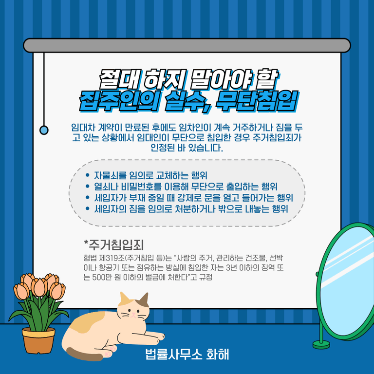 오늘은 임대차 계약 종료 후 세입자가 연락이 두절되고 짐이나 반려동물을 남겨두고 사라졌을 때, 집주인이 반드시 지켜야 할 법적 절차와 주의사항, 그리고 반려동물 유기에 관한 법적 책임까지 살펴보았습니다. 이런 일이 발생했을 때 감정적으로 대응하거나 임의로 조치를 취하면 오히려 불이익이 돌아올 수 있으니, 반드시 전문 변호사와 상담을 통해 정당한 절차를 따르는 것이 바람직합니다.