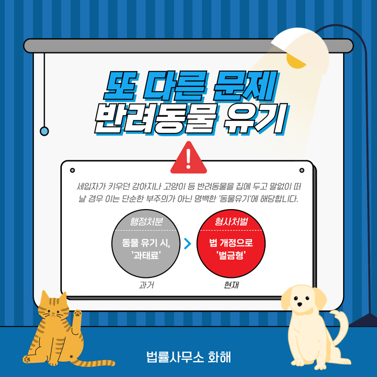 세입자가 키우던 강아지나 고양이를 집에 그냥 두고 아무 말 없이 떠나는 일도 생각보다 자주 일어나는데요. 이런 행동은 단순한 부주의가 아니라, 명백한 범죄인 ‘동물 유기’에 해당합니다. 과거에는 동물을 유기해도 과속 딱지처럼 과태료만 내면 끝났지만, 동물보호법이 개정되면서 지금은 300만 원 이하의 벌금형에 처해질 수 있습니다. 여기서 말하는 ‘벌금’은 단순한 행정처분이 아니라 형사처벌이기 때문에, 전과기록까지 남게 됩니다.