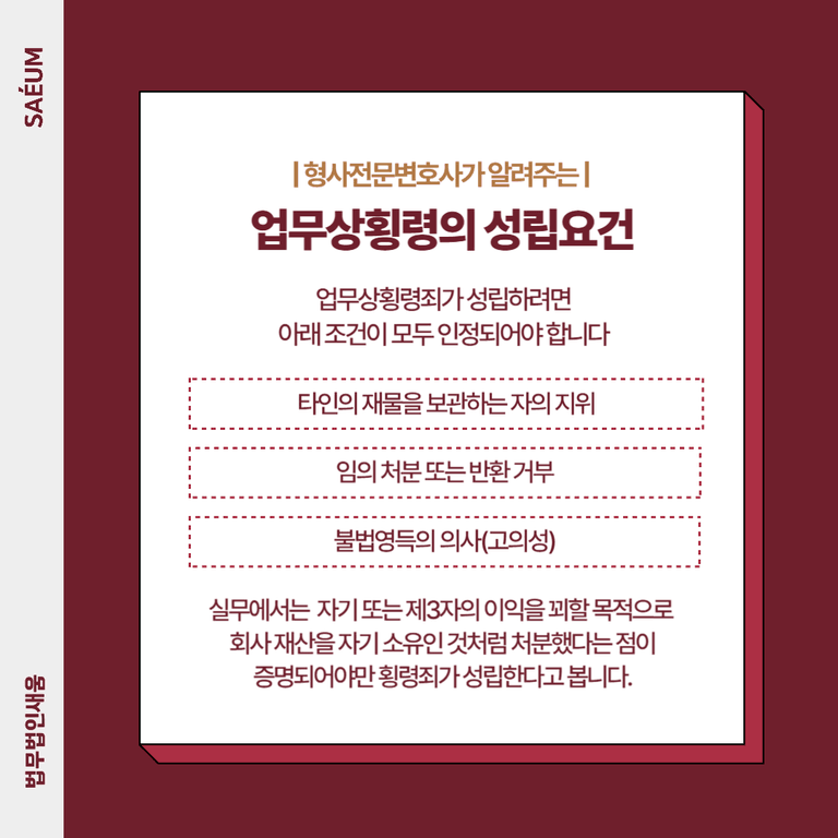 특히 대법원과 실무는 “불법영득의 의사”, 즉 자기 또는 제3자의 이익을 꾀할 목적으로 회사 재산을 자기 소유인 것처럼 처분했다는 점이 증명되어야만 횡령죄가 성립한다고 봅니다.