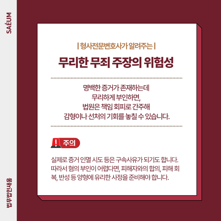 무조건 무죄만을 주장할 경우 오히려 불리한 결과를 초래할 수 있습니다. 명백한 증거가 존재하는데도 무리하게 부인하면, 법원은 책임 회피로 간주해 감형이나 선처의 기회를 놓칠 수 있습니다. 실제로 증거 인멸 시도 등은 구속사유가 되기도 합니다.