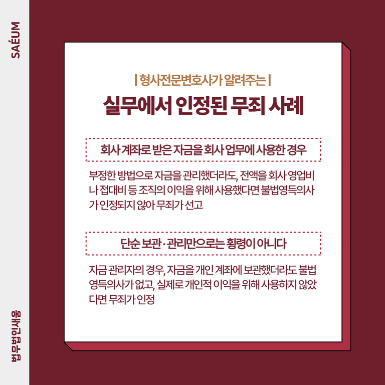 예를 들어, 회사 자금이 실수로 내 계좌에 입금되어 사용했지만 곧 반환했다면 고의성이 인정되지 않아 무죄가 될 수 있습니다. 또한 회사나 조직의 운영 목적, 영업상 필요에 따라 자금을 사용했다면 불법영득의사가 인정되지 않아 무죄 판결이 내려질 수 있습니다.