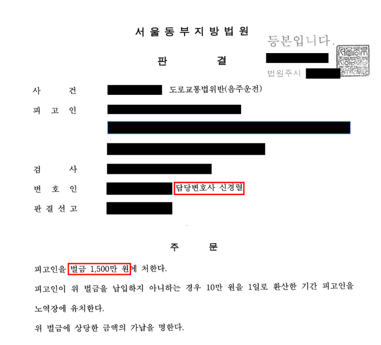 위와 같은 변호인의 조력과 의뢰인의 적극적이고 신속한 준비를 통해, 의뢰인은 5년 내 음주운전 3회차임에도 불구하고 벌금형을 선고받을 수 있었습니다.