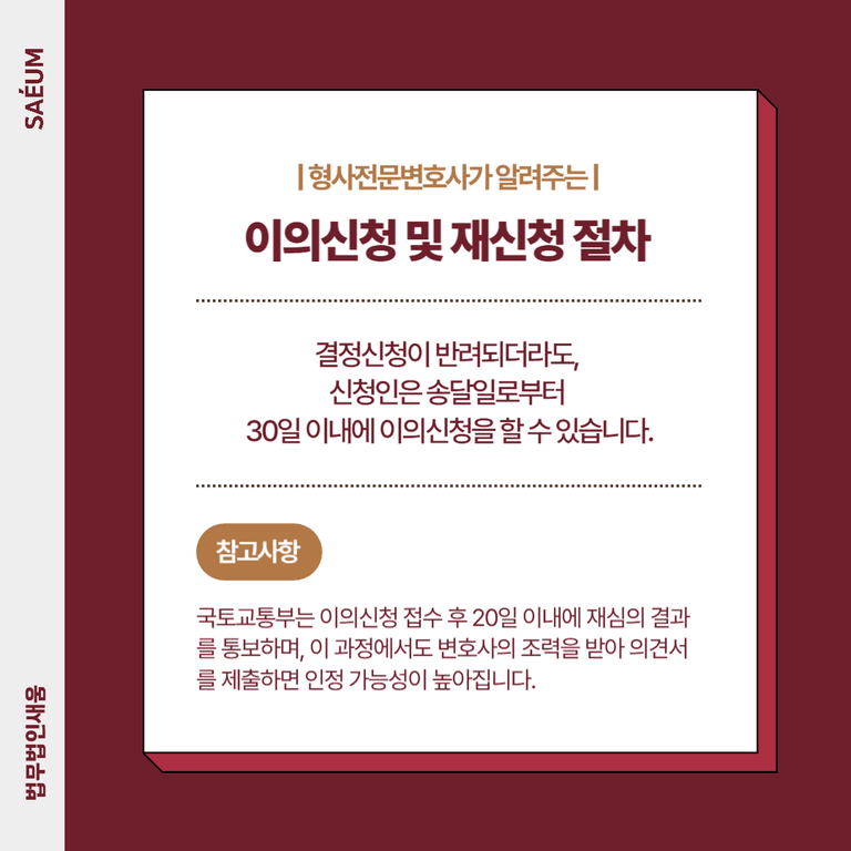 결정신청이 반려되더라도, 신청인은 송달일로부터 30일 이내에 이의신청을 할 수 있습니다. 국토교통부는 이의신청 접수 후 20일 이내에 재심의 결과를 통보하며, 이 과정에서도 변호사의 조력을 받아 의견서를 제출하면 인정 가능성이 높아집니다. 만약 이의신청이 기각된 경우에도, 향후 사정변경이 있으면 재신청이 가능합니다.