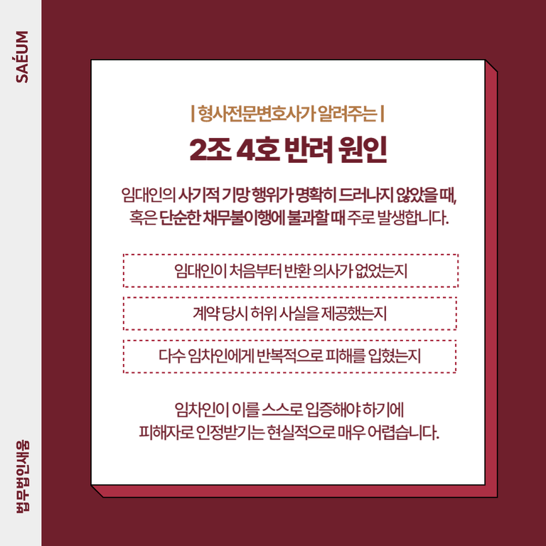 2조 4호 반려는 임대인의 사기적 기망 행위가 명확히 드러나지 않았을 때, 혹은 단순한 채무불이행에 불과할 때 주로 발생합니다.