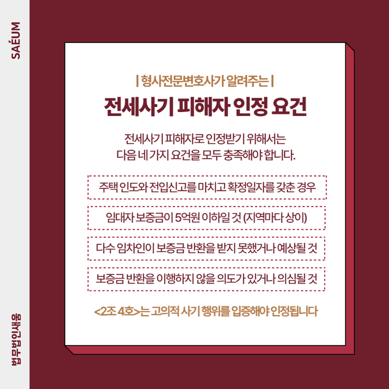전세사기 피해자로 인정받기 위해서는 다음 네 가지 요건을 모두 충족해야 합니다.