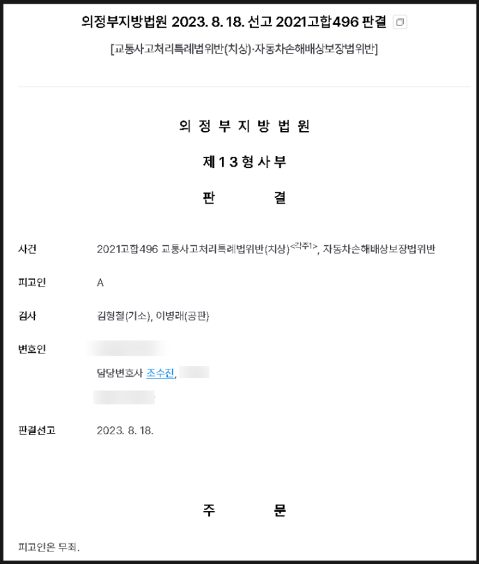 의정부지방법원은 저희의 주장을 받아들여, "검사가 제출한 증거들만으로는 피고인에게 의무보험 미가입으로 인한 자동차손해배상보장법 위반의 고의가 인정된다고 보기 부족하고, 달리 이를 인정할 증거가 없다"며 의뢰인에게 무죄를 선고했습니다.
