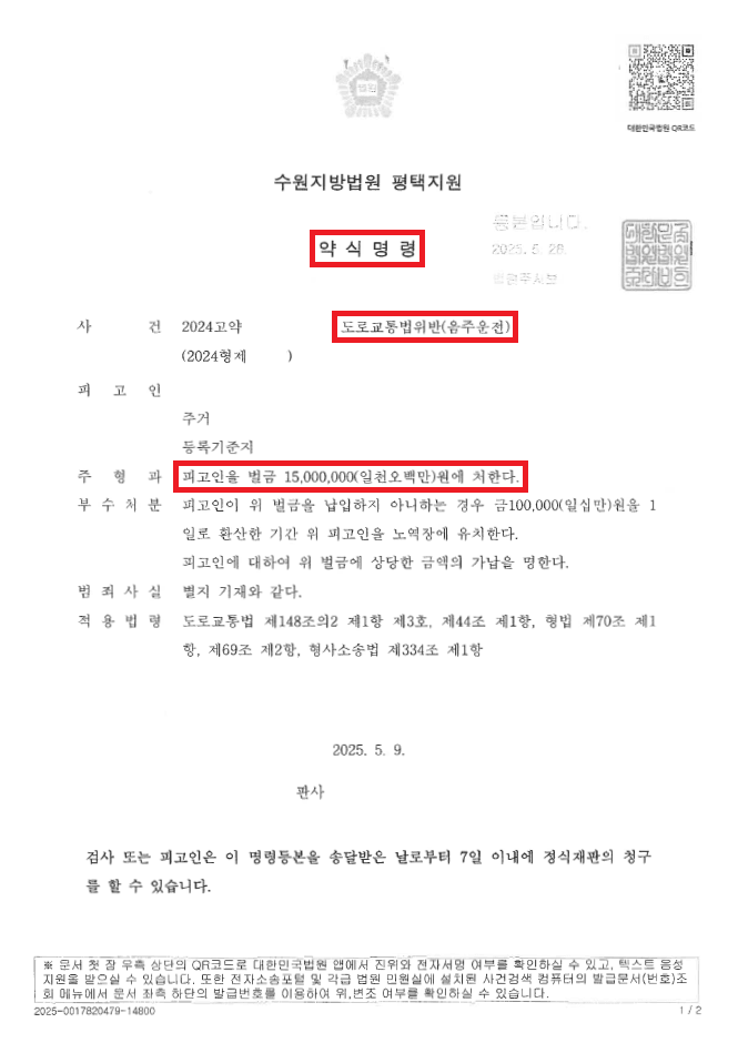 이러한 저의 조력을 바탕으로 A씨는 음주운전 이진아웃은 구공판이 원칙이었음에도 불구하고 이례적으로 약식명령으로 벌금형을 선고받음으로써 재판까지 나아가지 않고 신분상 중대한 불이익 위기에서 벗어날 수 있었습니다.