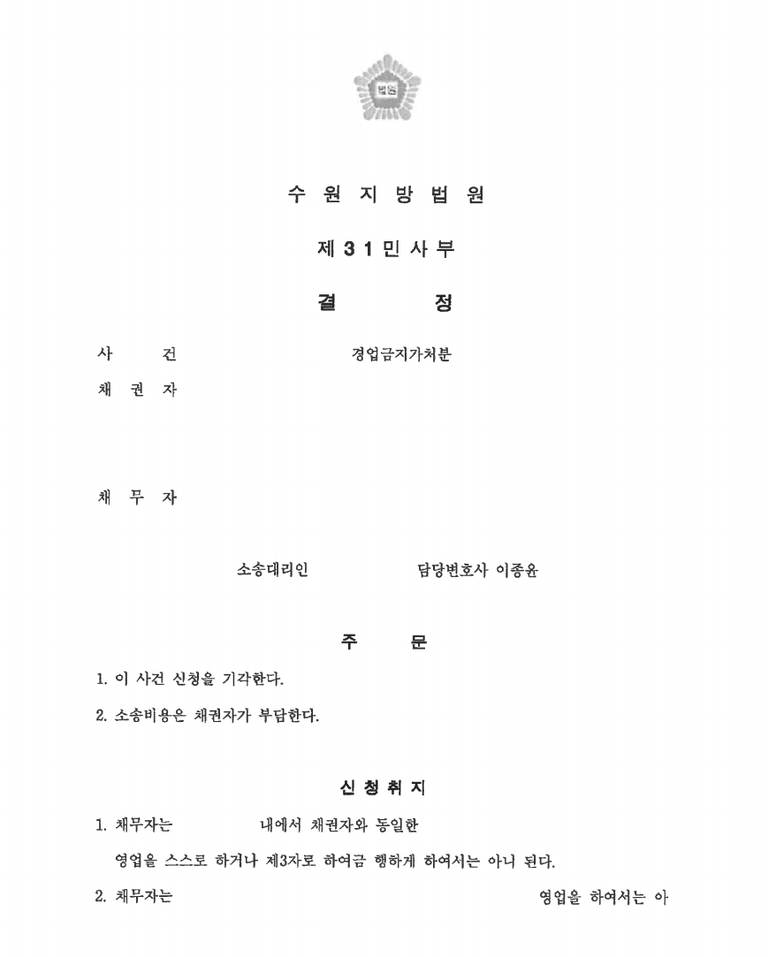 그 결과 법원은 "조합원의 반목·불화로 인한 대립으로 신뢰관계가 파괴되어 조합의 원만한 공동운영을 기대할 수 없게 된 경우도 민법 제720조의 부득이한 사유에 포함된다"고 판시하며 상대방의 가처분신청을 기각하였습니다. 상대방은 즉시항고를 포기하여 완전승소로 확정되었고, 의뢰인께서는 경업금지 제약 없이 자유롭게 사업을 영위할 수 있게 되었습니다.