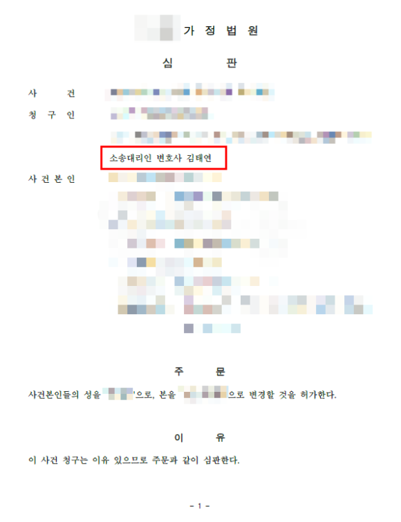 저희 태연법률사무소는 김태연 대표변호사님을 필두로 허가 받기 쉽지 않은 성본변경신청을 비롯하여 개명신청 성공사례를 다수 보유하고 있습니다.