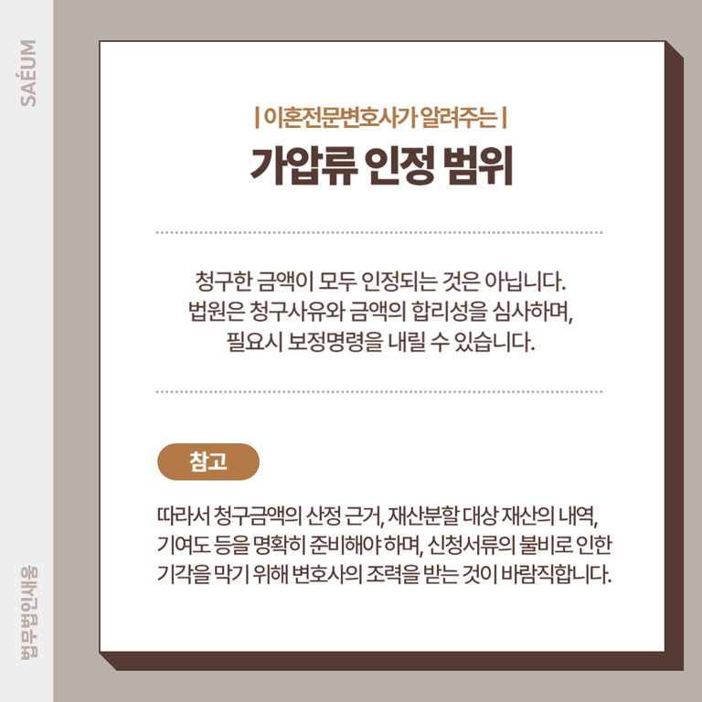 이혼 재산분할금이나 위자료 등 금전청구권이 있다면 이를 근거로 가압류를 신청할 수 있습니다. 하지만 청구한 금액이 모두 인정되는 것은 아닙니다. 법원은 청구사유와 금액의 합리성을 꼼꼼히 심사하며, 필요시 보정명령을 내릴 수 있습니다.