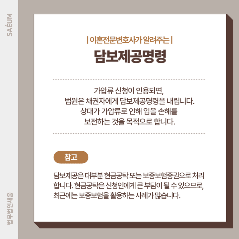 A씨는 이미 이혼 소송과 변호사 선임 등으로 현금 여유가 부족한 상황이었고, 법원에서 요구하는 현금공탁을 마련하기가 현실적으로 어려웠습니다. 법무법인 새움에서는 A씨의 경제적 사정과, 가압류 대상 채권의 존재 및 금액, 그리고 상대방의 재산 은닉 시도에 대한 정황을 꼼꼼하게 정리해 법원에 제출했습니다.