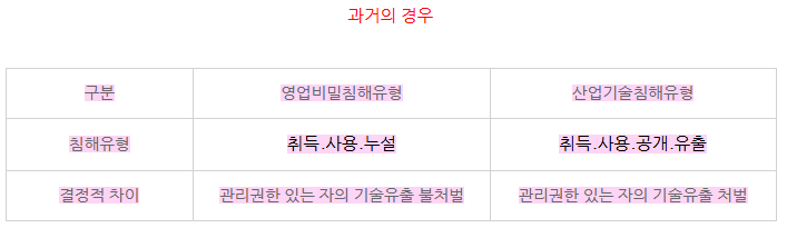 그 외에도 과거 산업기술침해유형으로 적시된 행위태양을 현행 부정경쟁방지법에서 대부분 도입을 함으로써 이제는 침해유형이 크게 차이가 나지 않게 되었습니다.