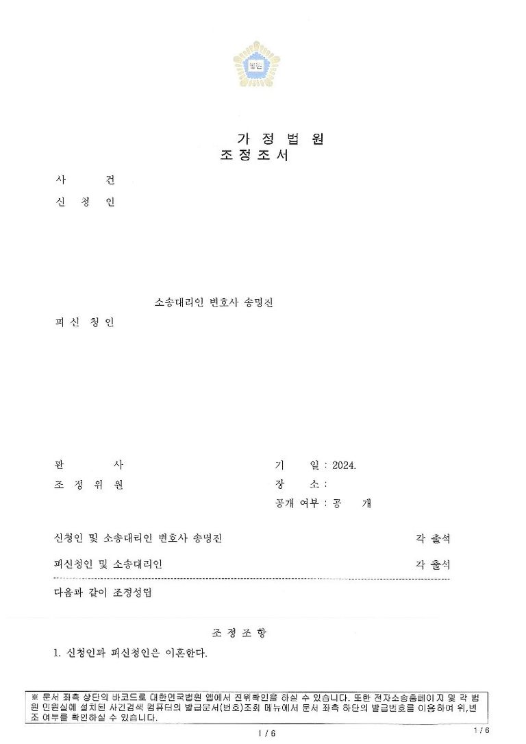 법원에 조정 신청서를 접수하여 상대방에게 이혼을 청구하였습니다.