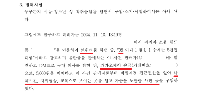 A씨는 2024. 11. 10. 13:19경 트위터를 하던 중 B양이 "08 아다ㅣ펨섭ㅣ숭계는 5천원 디엠"이라고 광고하는 글을 보고 B양에게 DM으로 구매 의사를 밝힌 다음 B양에게 카카오페이 송금으로 5,000원을 송금하고 B양으로부터 교복을 입고 가슴을 노출한 사진, 나체사진, 자위영상 등을 구입하였습니다.