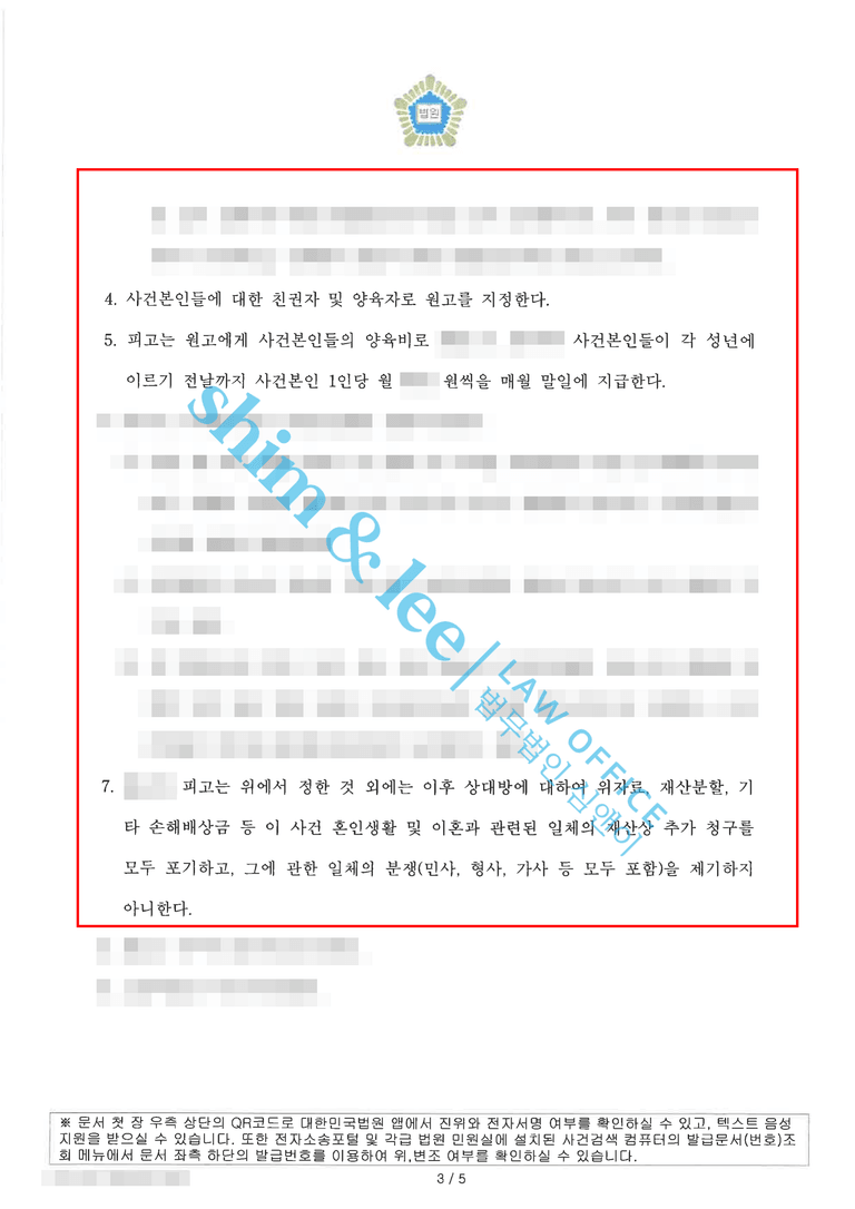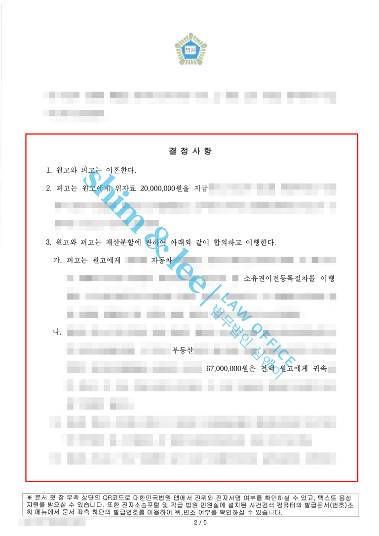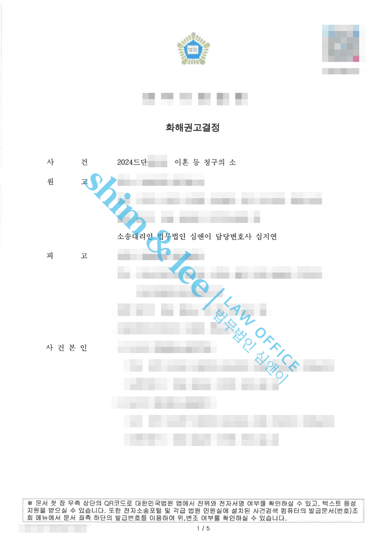 의뢰인은 단순한 이혼을 넘어서 배우자의 불법행위로 인한 손해에 대한 위자료 청구까지 함께 진행하기를 원하셨습니다. 이에 담당 변호사님은 재산분할, 양육비, 자녀 면접교섭권 등 전반적인 이혼 조건을 의뢰인에게 유리하게 구성하고, 가해자의 불법행위를 입증하는 송치 결정서를 첨부하여 소장을 접수하였습니다.
