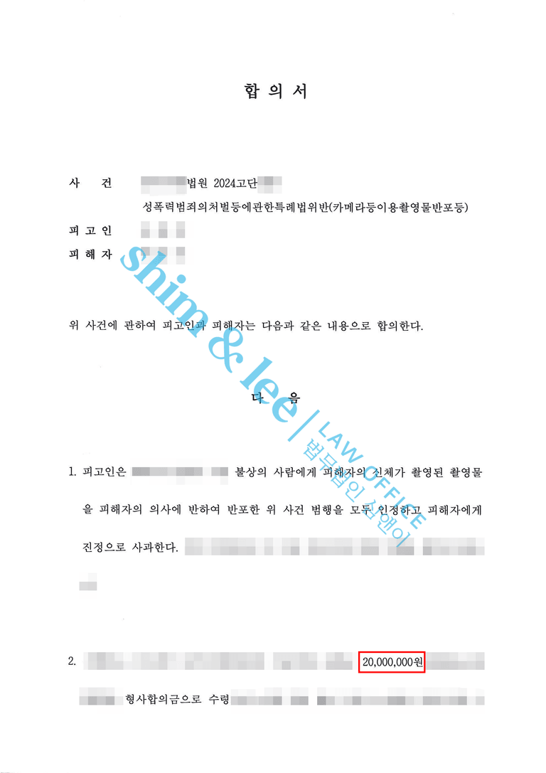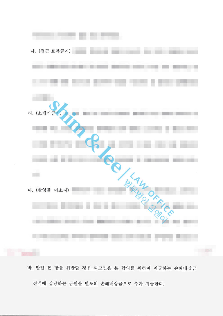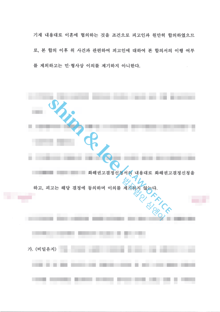- 대표 변호사님은 의뢰인님과 여러 차례 소통을 거쳐, ①이혼소송에서는 형사 합의를 전제로, 가해자가 이혼소송에서 재산분할을 전면 포기하고, 부동산과 자동차 등 모든 재산을 의뢰인에게 귀속시키며, 친권과 양육권 역시 의뢰인이 단독으로 갖는 조건에 동의하도록 설득하였습니다. 또한 양육비 금액까지 세부적으로 조율하여, 형사 합의를 원한다면 해당 조건들을 수용해야 한다는 점을 분명히 하였습니다. ②형사사건에서는 비밀유지, 접근 및 보복금지, 소제기금지, 촬영물미소지 등 부가조항을 포함하여 철저히 합의서를 작성했습니다.