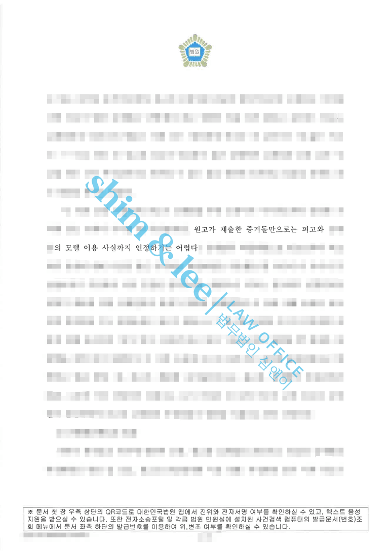 해당 시각, 의뢰인이 작성한 업무 문서와 팀원들과 주고받은 업무 메신저 기록 등을 통해 피고는 당시 업무중이었던 정황을 찾아내며 그 시간대에 피고가 A씨와 함께 있었을 가능성이 없다는 점을 객관적으로 입증하였습니다. 더불어, 원고가 제출한 숙박업소 결제 내역이 부정행위의 직접적인 증거가 될 수 없다는 점을 강력히 피력하였습니다.