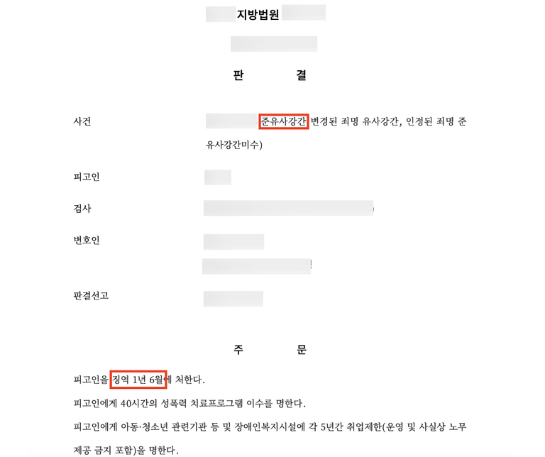 재판 과정에서 피고인은 끝까지 피해자와 합의된 스킨십이었다고 주장하며 범행을 부인했습니다. 그러나 피해자의 일관된 진술과 당시 상황 등을 종합적으로 고려하여 법원은 피고인에게 징역 1년 6개월과 성폭력 치료 프로그램 이수, 아동·청소년 및 장애인 관련 시설 취업제한 명령을 선고했습니다. 저는 피해자를 대리하여 고소와 법정 대응을 철저히 진행했고, 그 결과 가해자에게 실형이라는 중한 처벌을 이끌어낼 수 있었습니다.