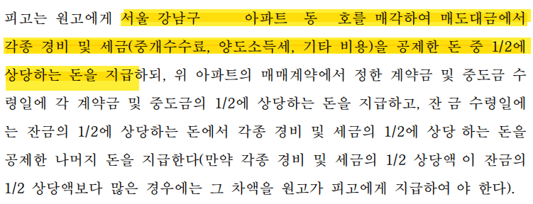 강남구 아파트를 매각 후 세금 및 제반 비용을 공제한 순수익의 50%씩을 분할하기로 결정되었습니다.