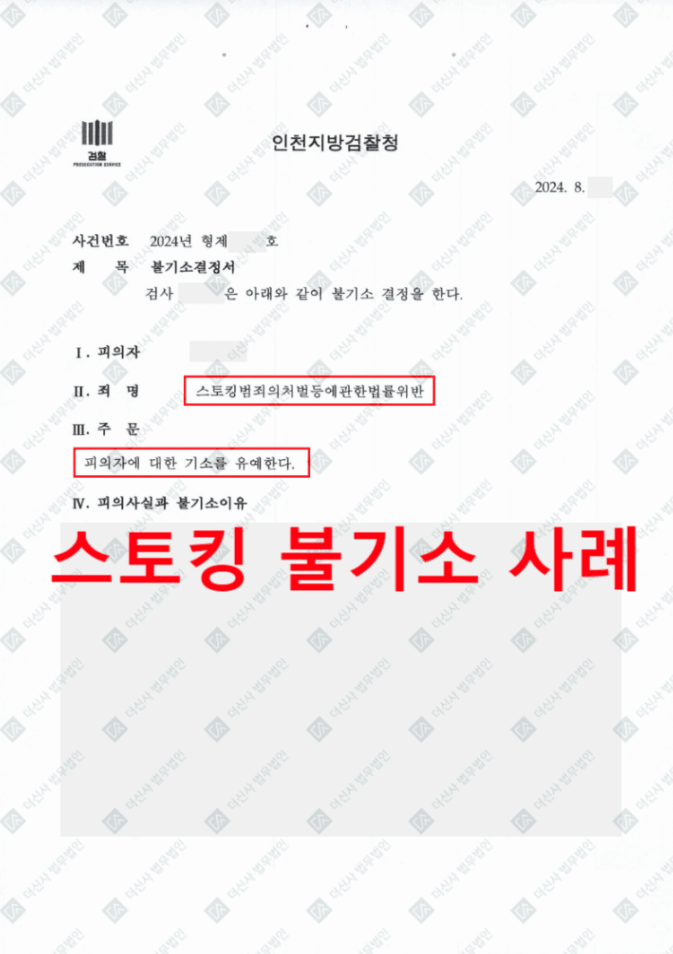 사건을 검토한 결과, 피해자의 불안감이나 공포심을 유발할 정도의 내용은 없었고, 총 3회에 불과한 연락 시도로 반복성과 지속성 요건이 부족하다는 점을 강조했습니다. 이러한 주장과 자료를 근거로 검찰은 무혐의, 불기소 처분을 내렸고, 의뢰인은 전과 없이 사건을 마무리할 수 있었습니다.