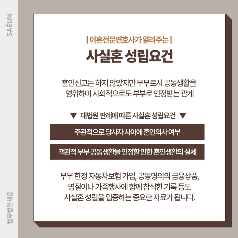 또한 부부 한정 자동차보험 가입, 공동명의의 금융상품, 명절이나 가족행사에 함께 참석한 기록 등도 사실혼 성립을 입증하는 중요한 자료가 됩니다.