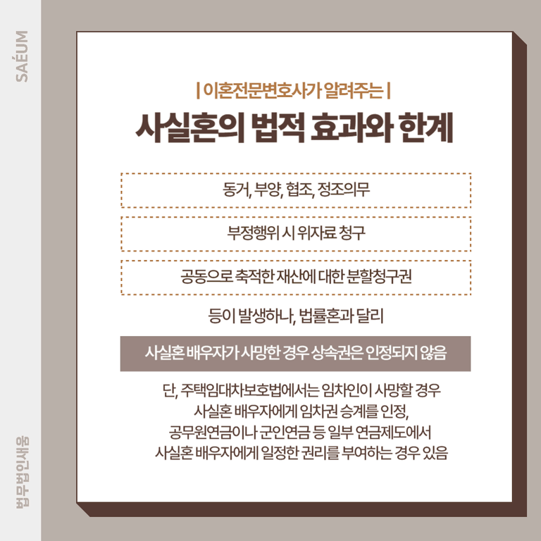 사실혼도 법률혼에 준하는 권리와 의무가 인정되지만, 입증책임과 한계가 명확합니다.