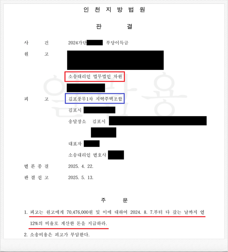 그러나 이후 피고 김포풍무1차 지역주택조합 측의 사업은 계획대로 진행되지 않았고, 이에 의뢰인께서는 납입금 반환을 구하는 민사소송을 정식으로 진행하길 원하셨습니다.
