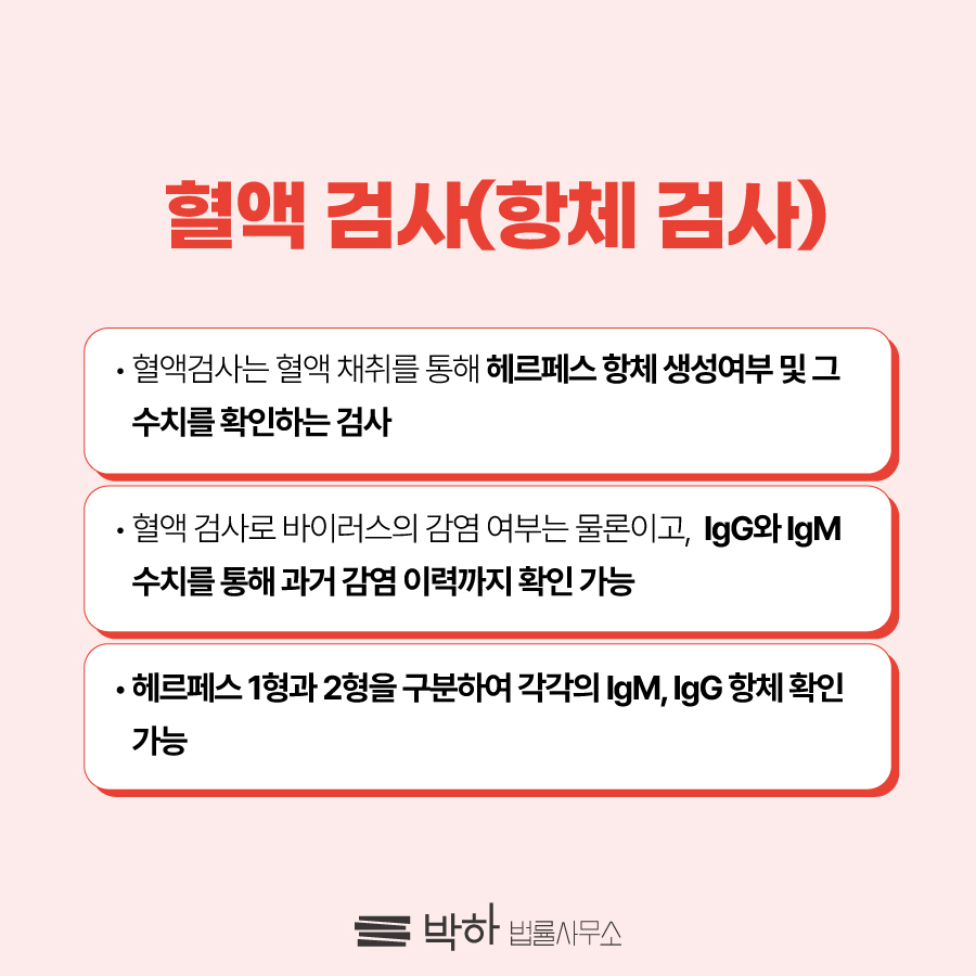 헤르페스 바이러스 고소 사건의 핵심은 상대방으로 인해 피해자가 감염된 것이 맞는가, 즉 인과관계의 증명일텐데요. 헤르페스 감염 고소를 앞둔 피해자라면 감염의 시기를 가늠해볼 수 있는 혈액 검사를 반드시 받아보셔야 합니다.