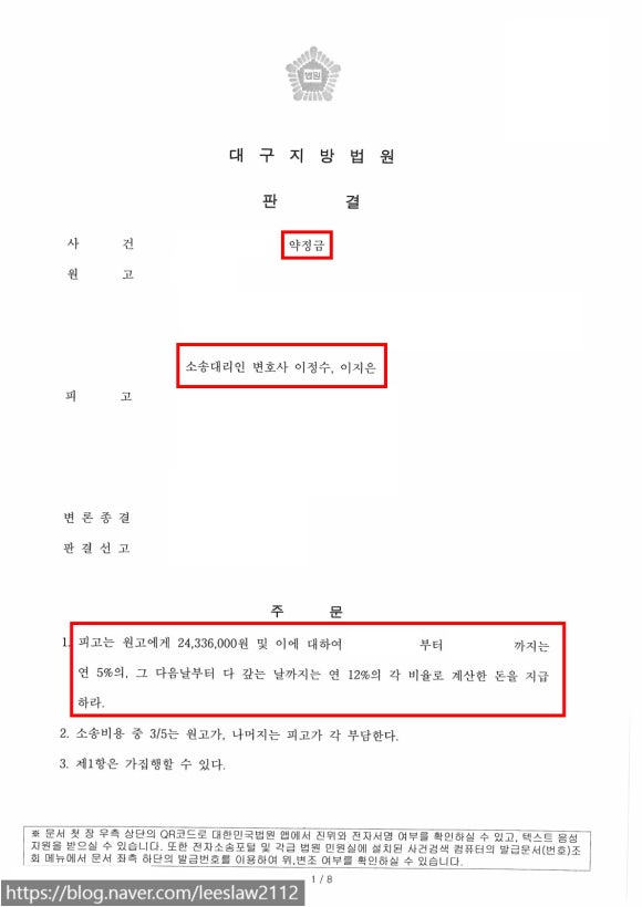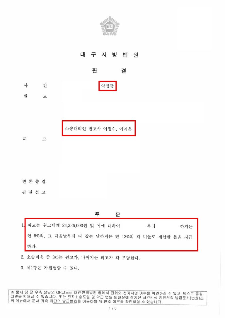 소송결과, 청구한 금액 중 일부인 약 2천 4백만원을 인정받을 수 있었는데요.